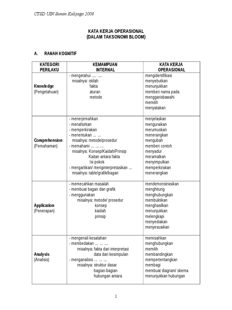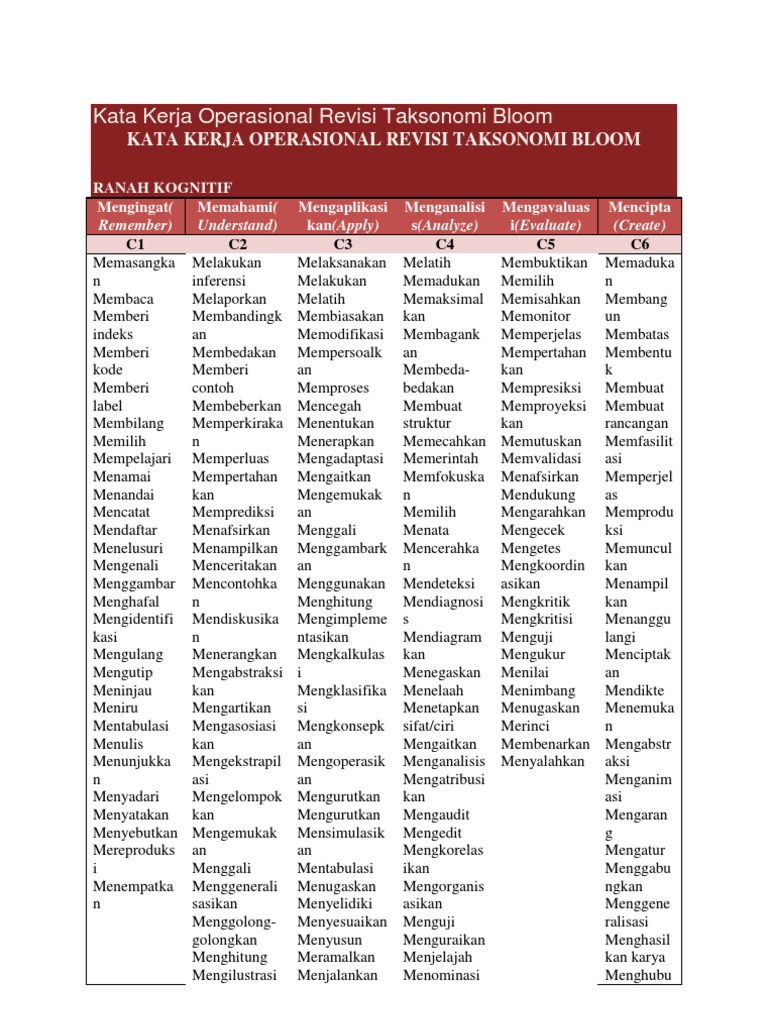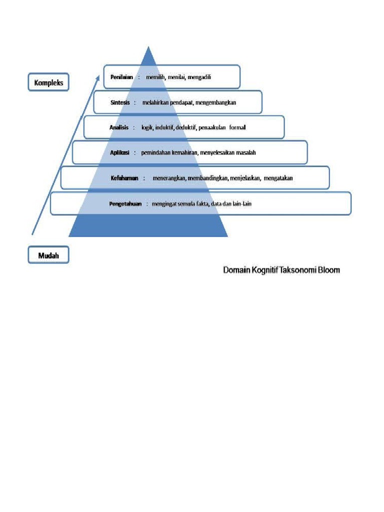 Taksonomi Bloom Revisi Terbaru 2020 PDF | Definisi dan ... from zonapengertian.com Taksonomi ini pertama kali dirancang oleh benjamin s tabel kata operasional ini hasil dari in house training revisi kurikulum. Domain kognitif taksonomi bloom merupakan satu aras yang digunakan sebagai elemen di dalam pentaksiran. Aras kognitif yang melibatkan proses pengembangan pemikiran. Taksonomi bloom merujuk kepada taksonomi yang dibuat untuk tujuan pendidikan. Bu taksonomi çeşidi bilgi ve zihinsel becerilerin gelişimini içerir. Istilah atau kata tugas yang digunakan dalam soalan ialah menyatakan, menerangkan, menamakan dan melabelkan. Domain taksonomi bloom menitik beratkan aspek kognitif atau pengetahuan. Takonomi bloom menghuraikan aras yang terdapat aplikasi menggunakan maklumat dalam situasi yang baru, termasuk menyelesaikan masalah menggunakan prinsip, kaedah, hukum, teori, formula.