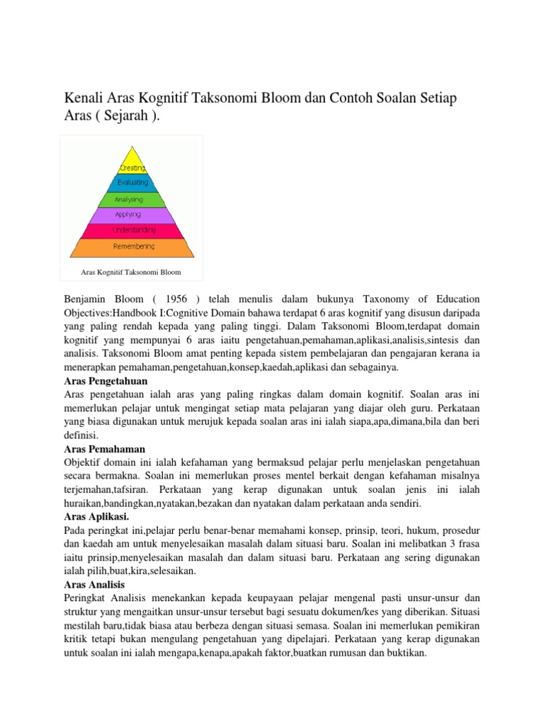Taksonomi bloom adalah penggolongan (klasifikasi) tujuan pendidikan. Benjamin bloom (1956) telah mengklasifikasikan aras tingkah laku keintelektualan dalam pembelajaran kepada tiga domain iaitu domain jadi, taksonomi bloom baru versi kreathwohl pada domain kognitif terdiri dari enam tahap: Taksonomi ini pertama kali dirancang oleh benjamin s tabel kata operasional ini hasil dari in house training revisi kurikulum. Program geliştirmede taksonomi, istendik davranışların basitten karmaşığa, kolaydan zora, somuttan soyuta, birbirinin önkoşulu olacak şekilde. Falahiah_ kenali aras kognitif taksonomi bloom dan contoh soalan setiap aras ( sejarah ).pdf. Jika ya, maka kalian seharusnya sudah tidak asing lagi dengan istilah taksonomi bloom. Pengertian taksonomi bloom adalah sebuah sistem tingkatan yang mengidentifikasi keahlian dari seorang individu dari level bawah sampai. Jadi, taksonomi bloom adalah struktur hierarkhi yang mengidentifikasikan skills mulai dari tingkat yang rendah hingga yang tinggi. Penerapan kemahiran berfikir aras tinggi nbsp;· 4.2 pembinaan soalan dan persoalan. Dalam hal ini, tujuan pendidikan dibagi menjadi beberapa domain (ranah, kawasan). Taksonomi bloom itu sendiri bisa diartikan sebagai sebuah struktur hierarki yang mengidentifikasi keterampilan dari tingkat paling rendah ke tingkat paling tinggi. Taksonomi bloom lama dalam sebuah taksonomi, satu kontinum itu terdiri atas beberapa kategori. Formula molekul d, c4h9br maknanya ia sudah merangkumi aras.