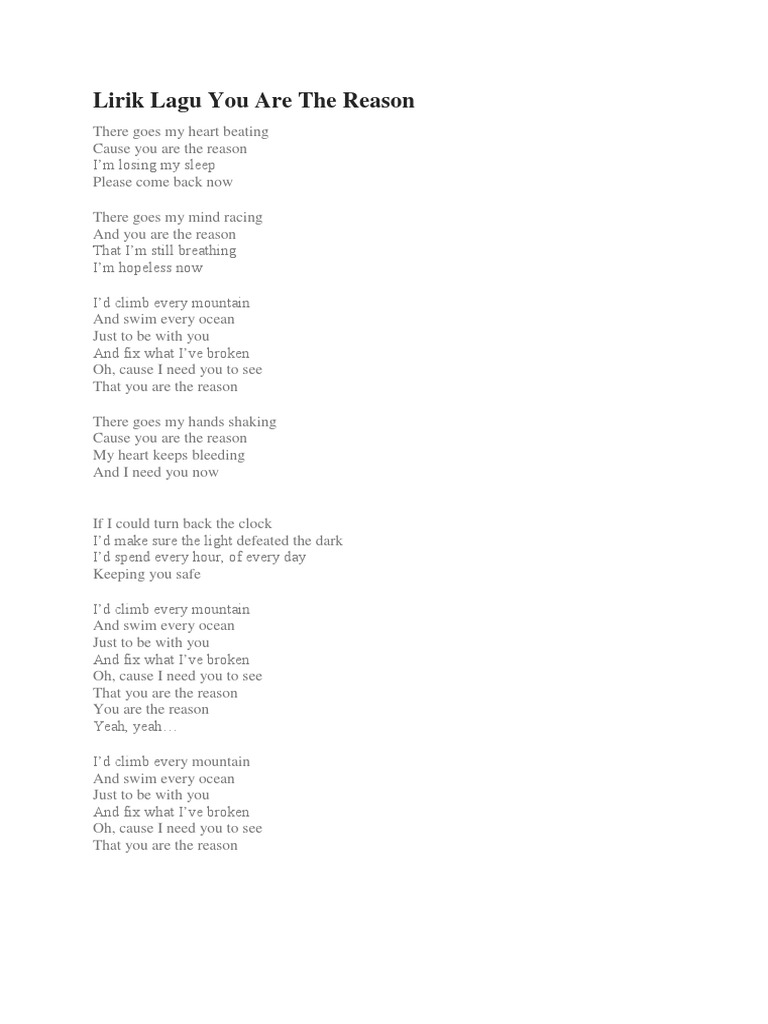 Lagu ini bisa kamu dengarkan di spotify, joox, itunes, apple music, dan platform. Terjemahan lirik lagu you are the reason adalah arti lirik per lirik yang bisa sobat ikuti untuk mengetahui makna lagu, ditulis secara langsung tidak menggunakan mesin, tapi cukup sobat yang menilainya. Cause you are the reason my heart keeps bleeding and i need you now. There goes my hands shaking cause you are the reason my heart keeps bleeding and i need you now. And i'd climb every mountain and swim every ocean just to be with you and fix what i've broken oh, cause i need you to see that you are the reason.